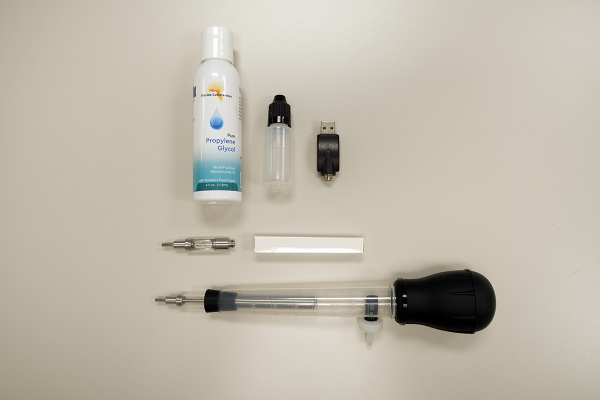 - Kleine Flasche mit kleinem Einfüllnippel zur Betankung des Verdampfers